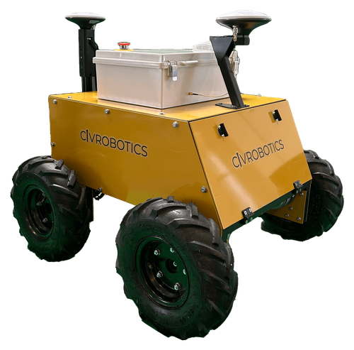 Civ Robotics remote controlled CivDOT can layout outdoors, in all terrain conditions. CivDOT can mark survey information with spray paint, dashed lines, or laser points. This technology has tilt correction with a 10” clearance and is compatible with top brands of GNSS receivers, collecting elevation and location.